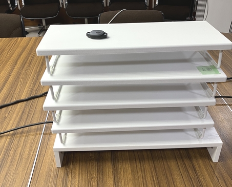 次はテーブルの上に置いた5つの棚の上をタグを移動させて、その時に高さが変化する様子を撮影した動画です。
