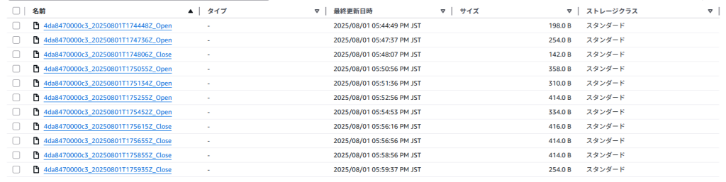今回はPoCのため、簡易的にAWSのS3を使ってOpen/Closeが判別できるログを格納。